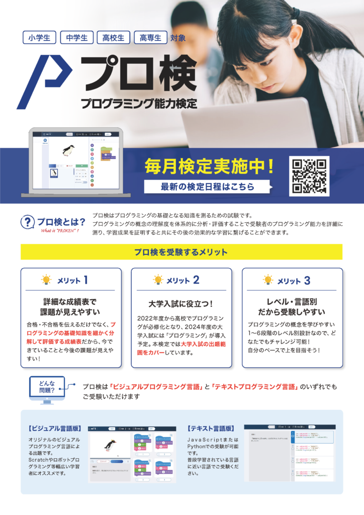 プログラミング能力検定(通称 プロ検)とは全国2286会場で検定を開催している国内最大級の試験です。
