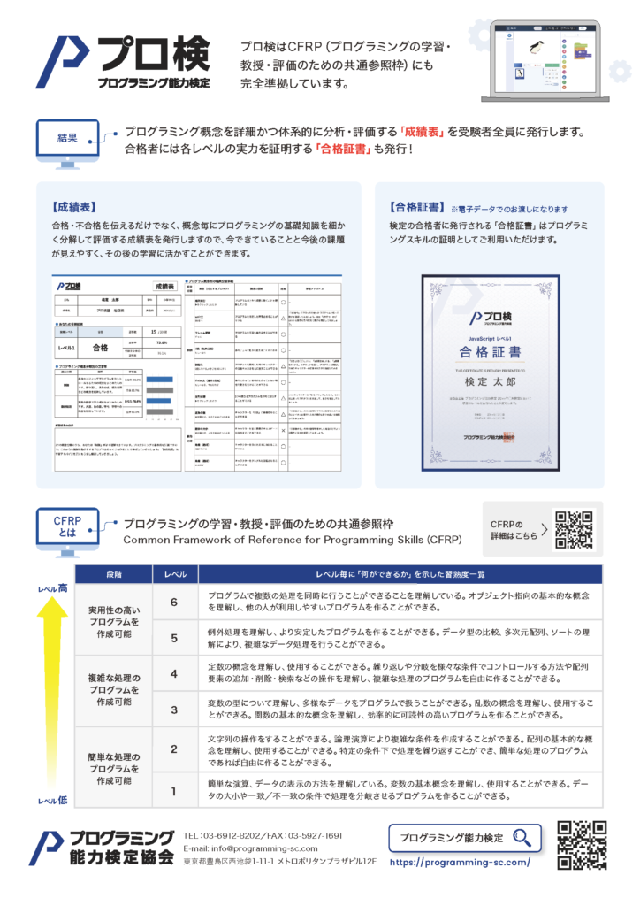 プログラミングの基礎となる知識を測るための試験で、2022年度より高校にて必修化される「情報Ⅰ」のプログラミングに関する領域に対応し、2024年度の大学入学共通テストから必修となる情報科目としてのプログラミングへの対策試験となることを目指している組織です。